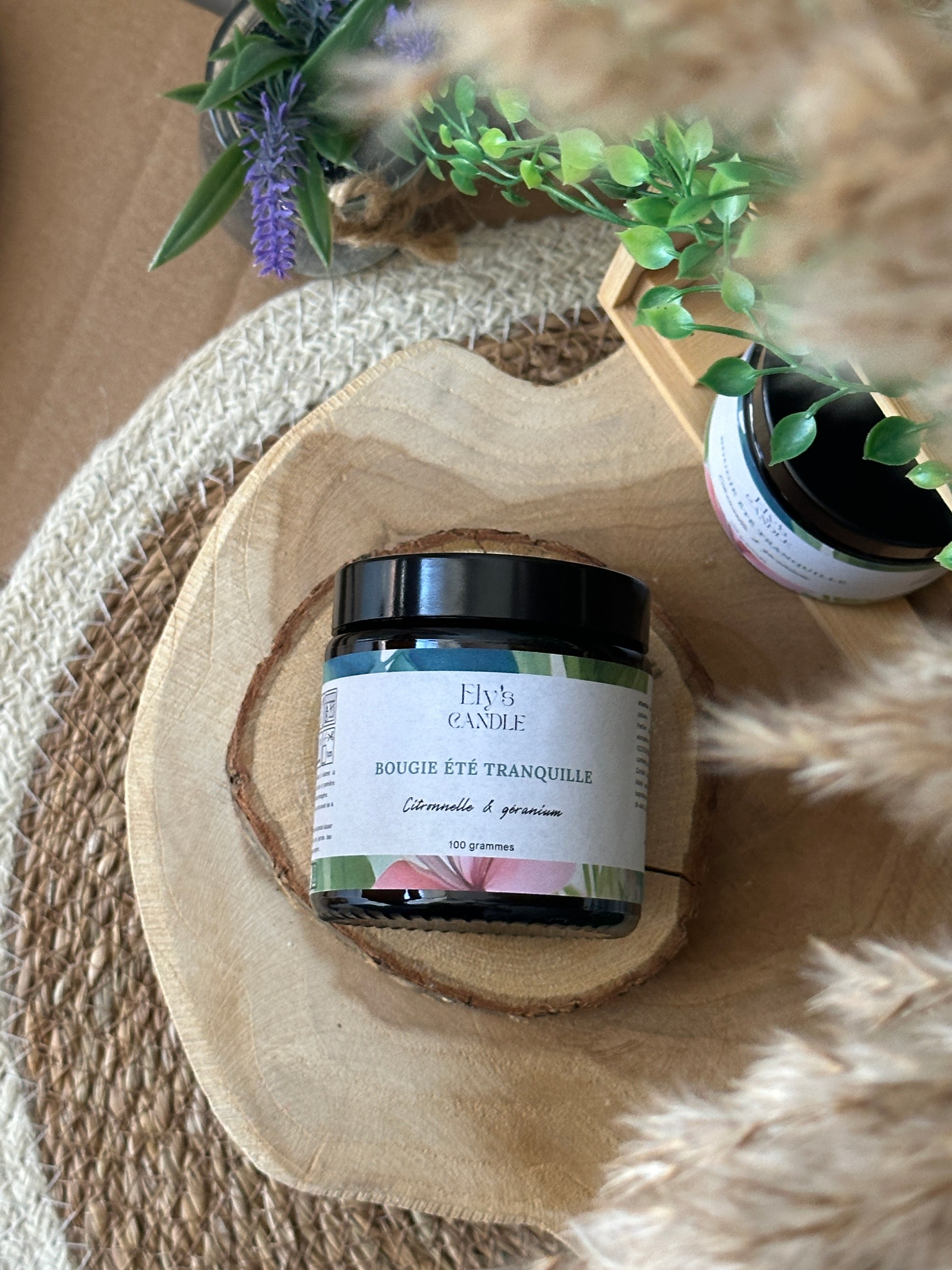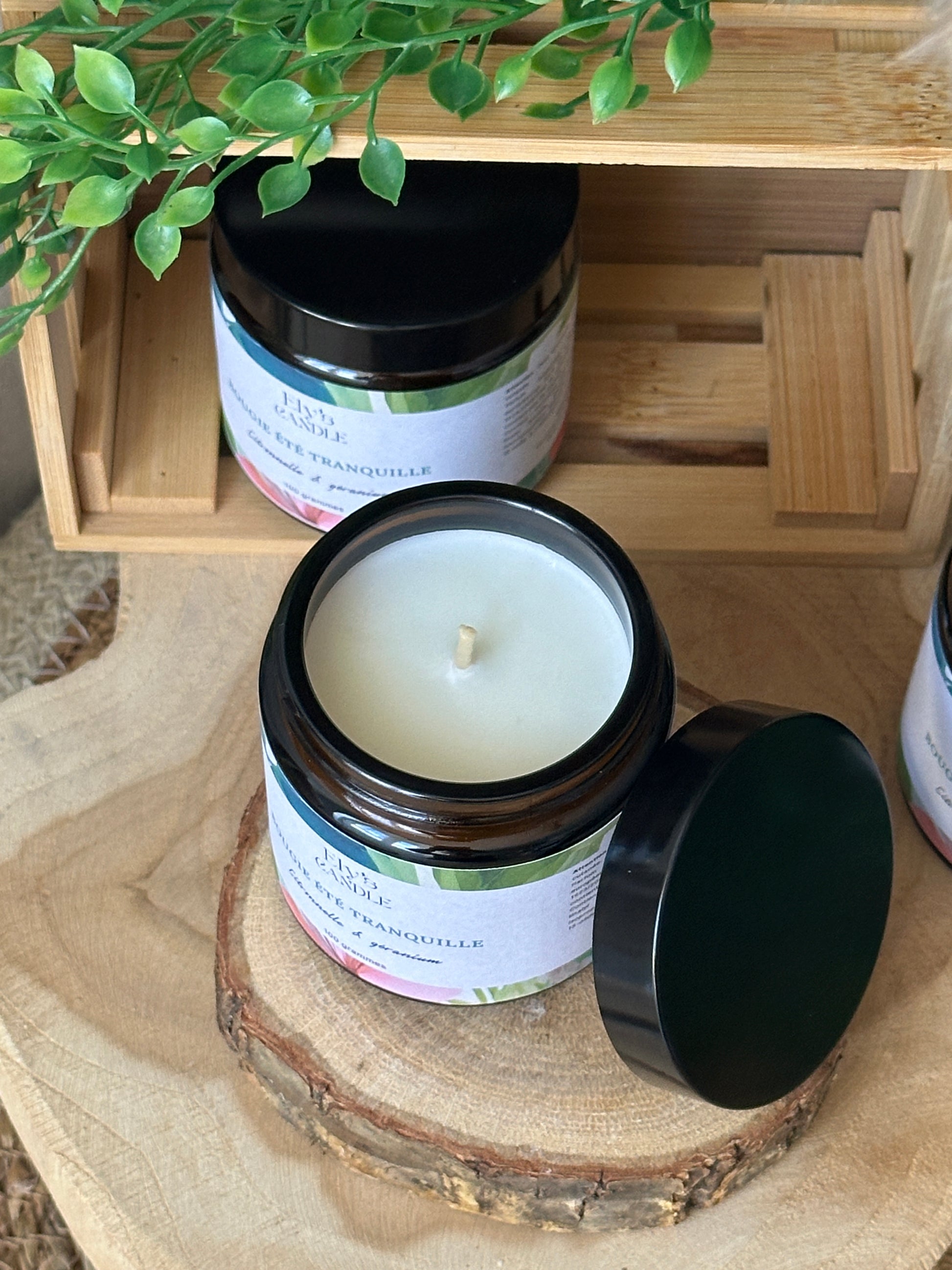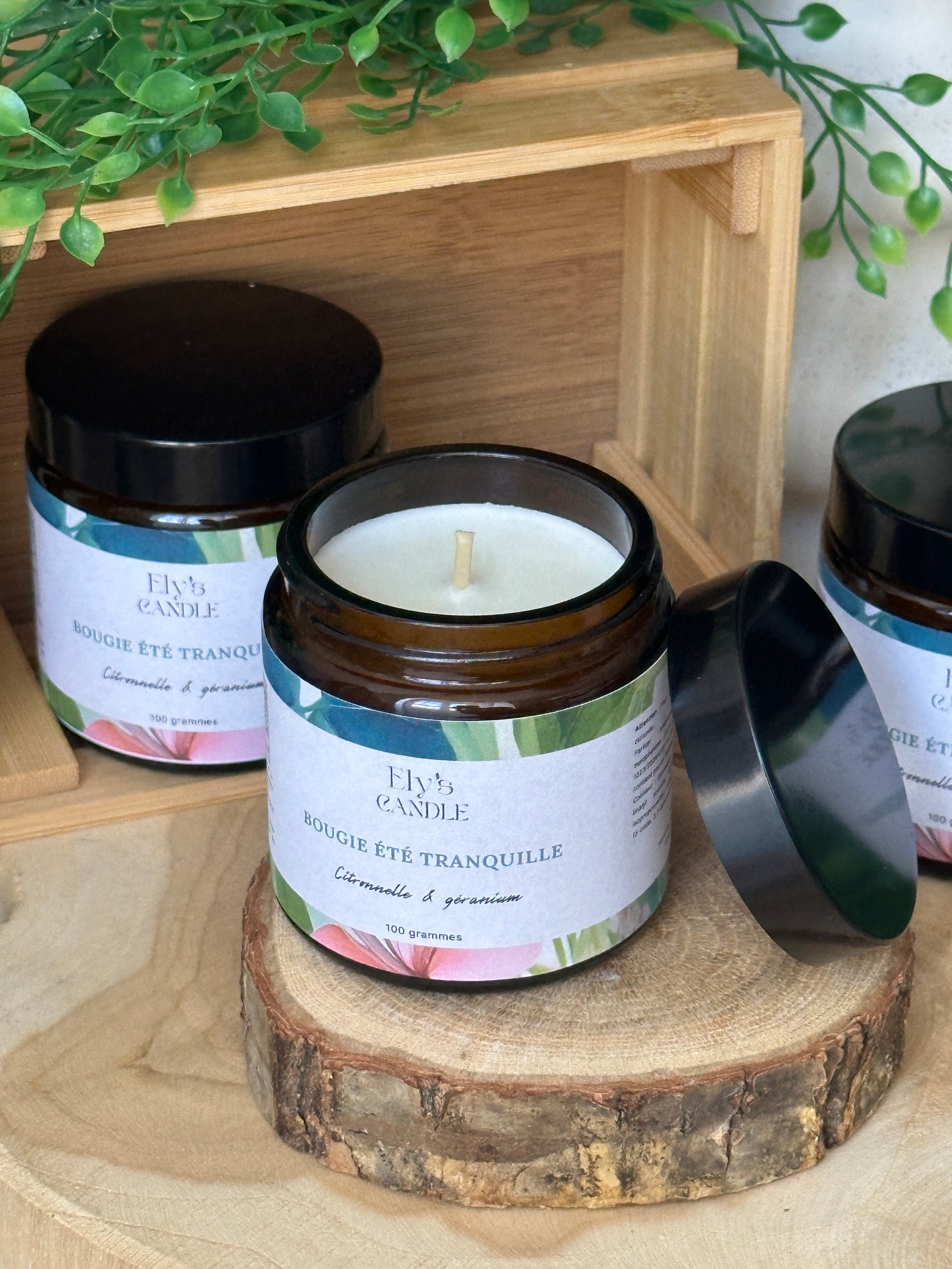 La bougie Été Tranquille a été pensée pour accompagner vos moments d’été avec douceur. Son parfum, soigneusement sélectionné, est composé d'une synergie d'odeurs traditionnellement utilisées pour créer une atmosphère moins favorable aux insectes (à utiliser en intérieur ou en extérieur). Fraîche, aromatique et citronnée, cette bougie est une invitation à profiter pleinement de vos soirées d'été… sans désagrément.