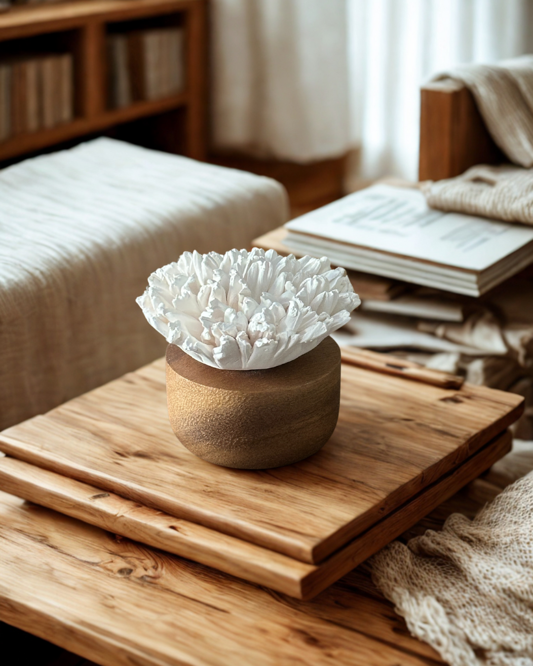 La fleur blanche, inspirée des oeillets du Japon, diffuse lentement votre parfum préféré sans nécessiter d’électricité ni de piles — une solution élégante, naturelle et silencieuse pour parfumer vos espaces.