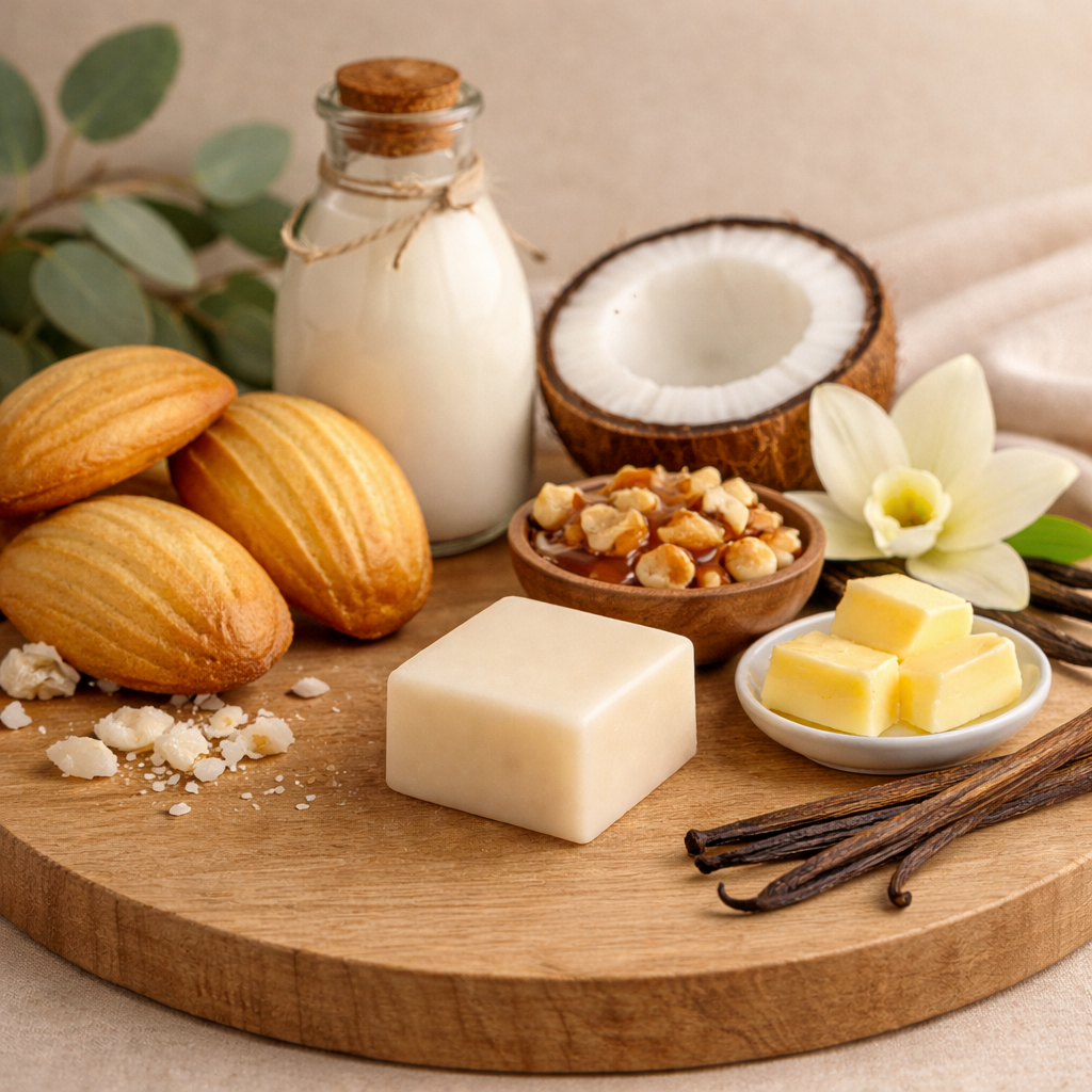Madeleine gourmande : Lait, praline, noix de coco, beurre, vanille