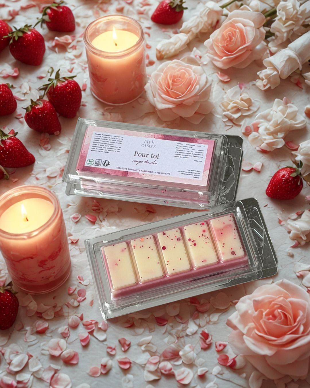 La cire utilisée pour les fondants parfumés est la cire d'olive (sans CMR, sans OGM, sans phtalates, vegan, sans cruauté animale)